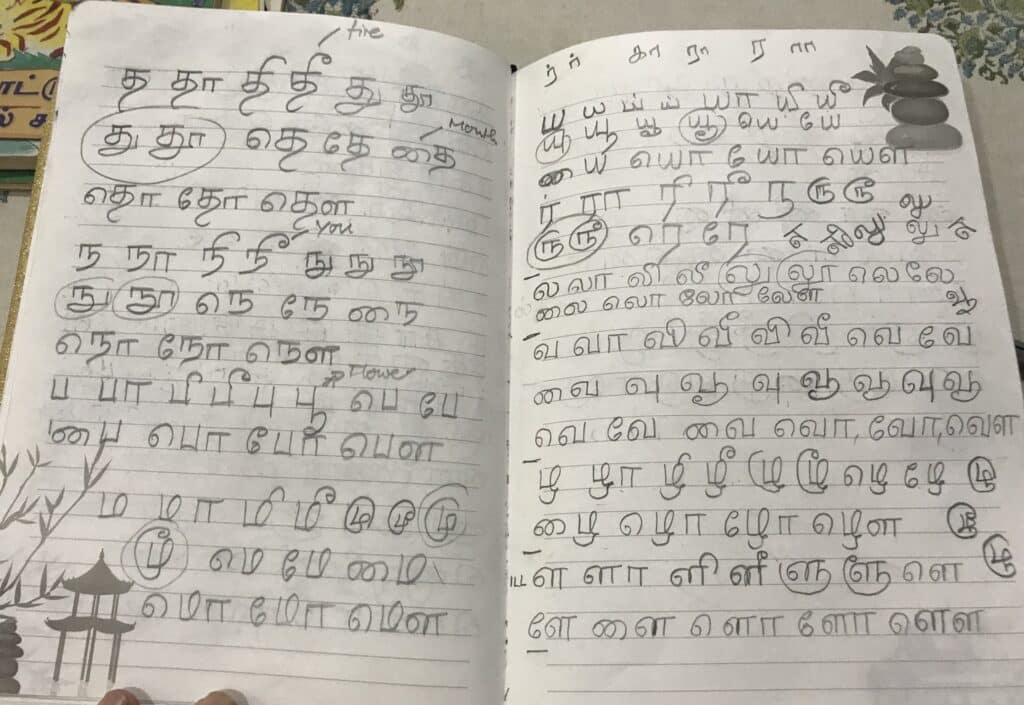 Ich staune dieser Tage über mich selbst. Das Tamil-Alphabet, das ich 2006 einmal gelernt hatte, aktiviert sich fast wie von selbst. Dass ich dies mit so einer Leichtigkeit bewältige und mich noch so gut erinnere, hätte ich nicht gedacht. Auch mein Wortschatz ist gar nicht so klein, wie ich gedacht hätte.